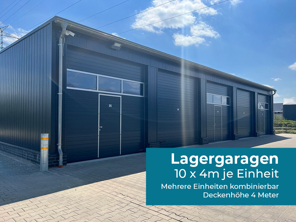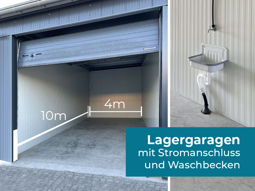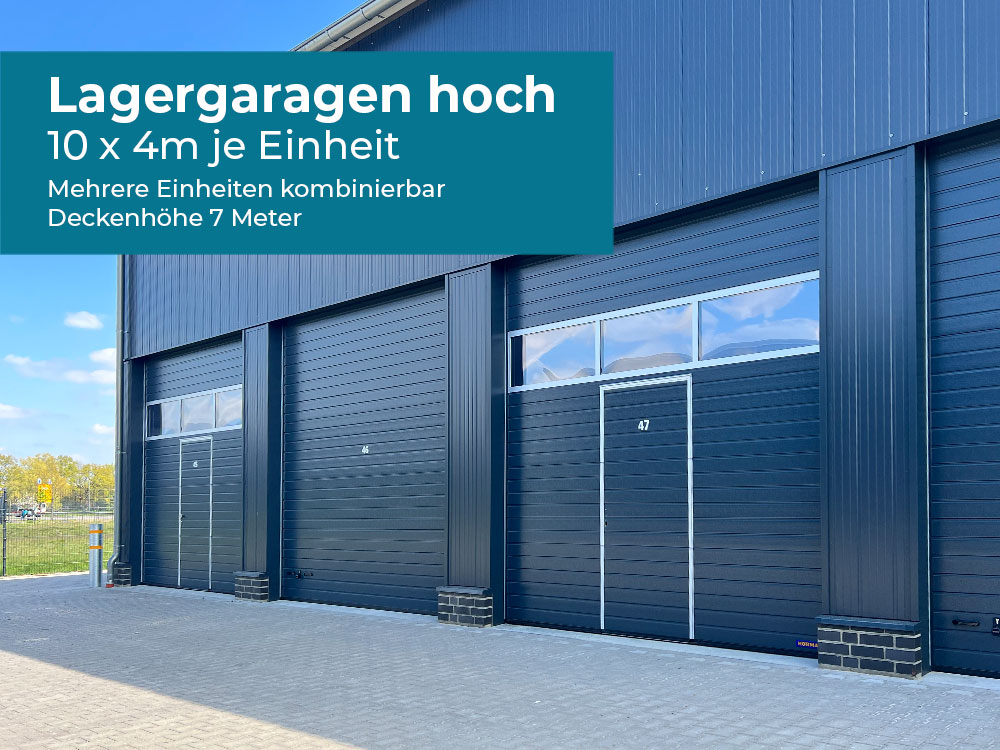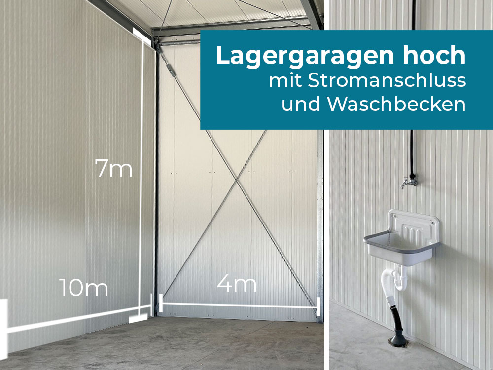 Die hohen Lagergaragen haben Maße von 10 x 4m