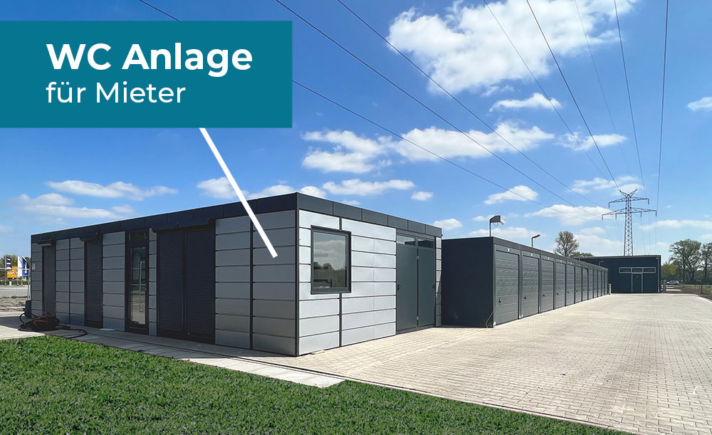 Auf dem Gelände befindet sich neben unseren Garagen, Lagergaragen und Lagerhallen auch eine WC Anlage, die von den Mietern genutzt werden kann.